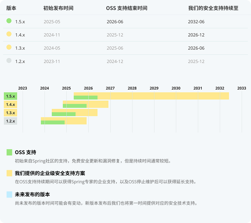 1.5.x 分支为该框架的最后一代独立版本,可参考开源软件(OSS)与企业级支持时间线了解维护周期。